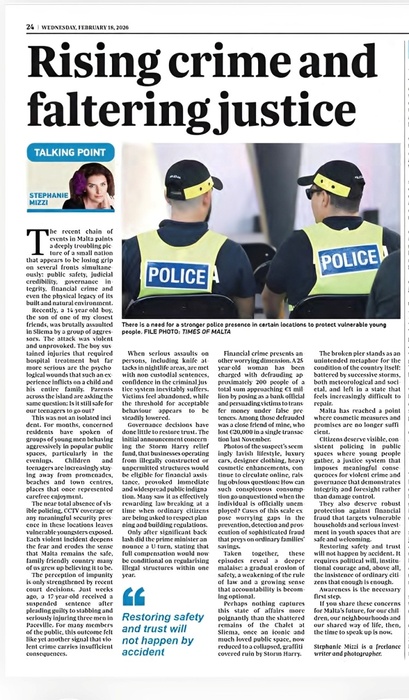 My article on Times of Malta-18.2.2026 - Rising crime, faltering justice & a fading sense of safety
